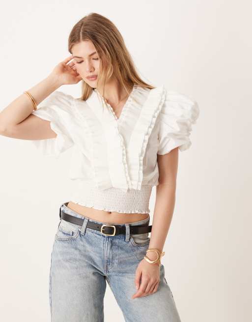 YAS – Vit poplintopp med puffärmar och veckad volang