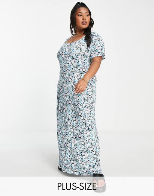 Yours – Blå småblommig midiklänning med fyrkantig ringning