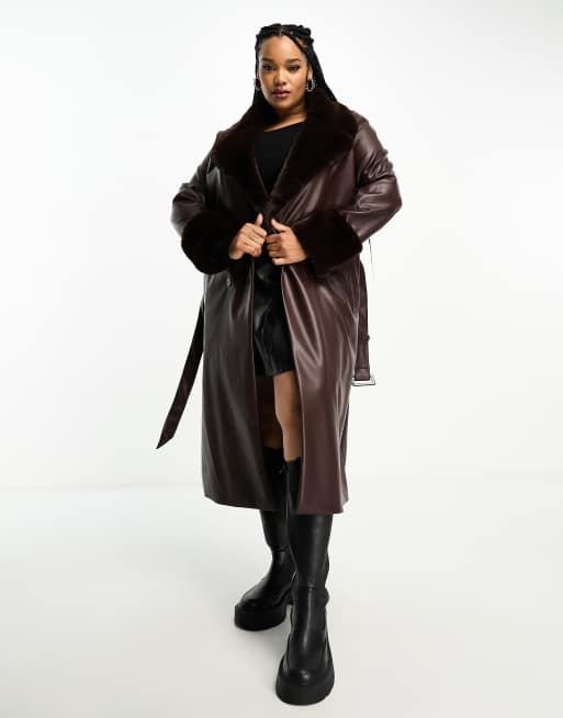 Yours – Brun kappa med skärp och fuskpälsdetalj i PU