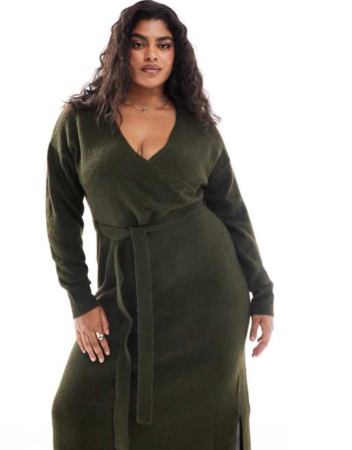 Yours – Exklusiv – Kakifärgad, stickad midiklänning med v-ringning och omlottdesign