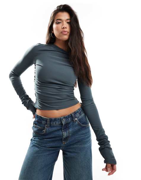 ASOS DESIGN soft handle off shoulder ruched long sleeve top in olive