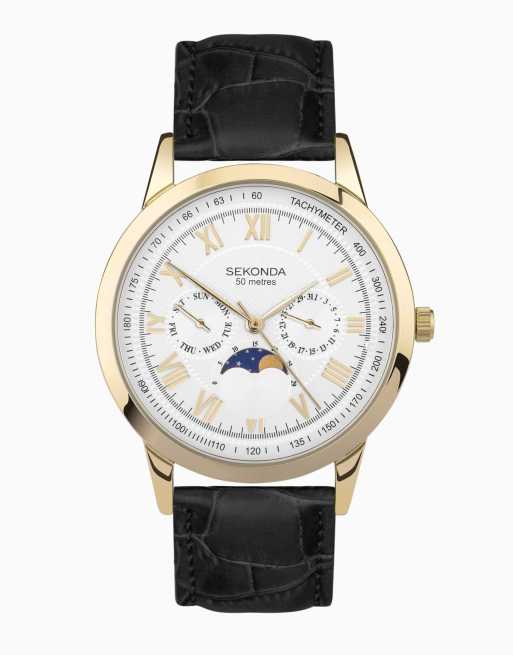 Sekonda Armstrong 40mm Moon Phase Mens Watch Gold Alloy Case & Black Leather Strap with Silver Dial