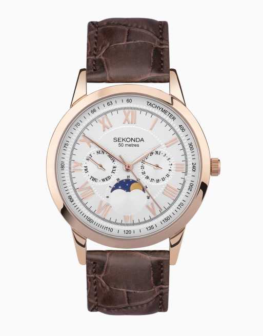 Sekonda Armstrong 40mm Moon Phase Mens Watch Rose Gold Alloy Case & Brown Leather Strap with Silver Dial
