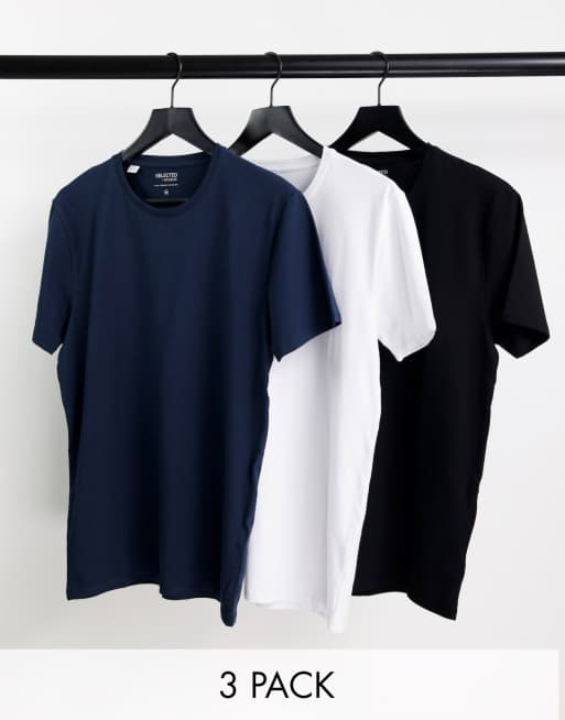 Selected cotton blend 3 pack t-shirts in black, white and navy