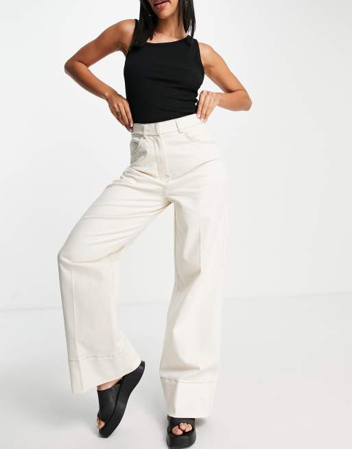 Selected cotton tailored wide leg trousers with contrast stitch in cream