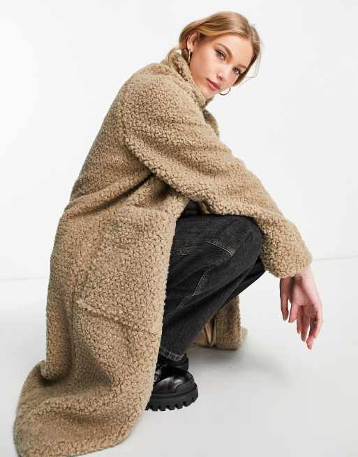 Selected Femme teddy longline coat with oversized pockets and funnel neck in beige