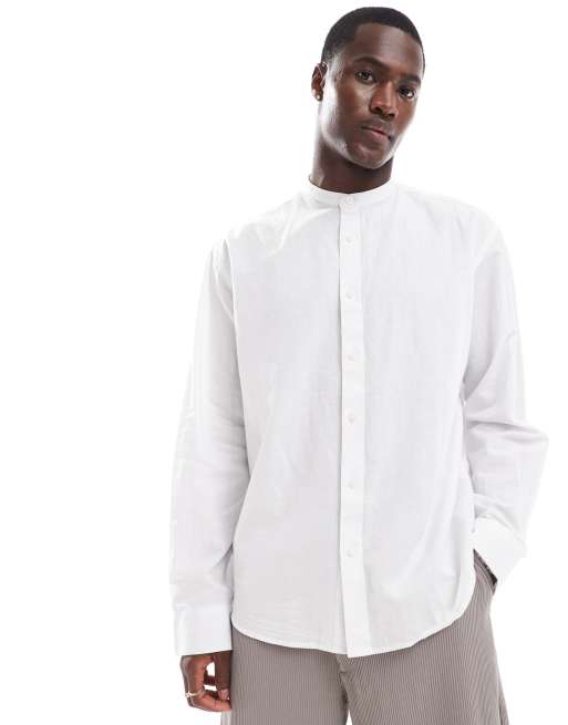 Selected oversized linen mix grandad collar shirt in white