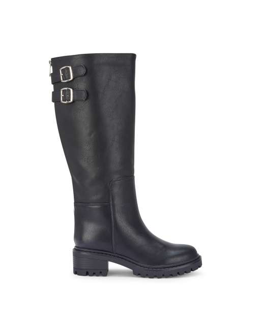 SEQWL Block heel casual calf boots with metal buckles in black