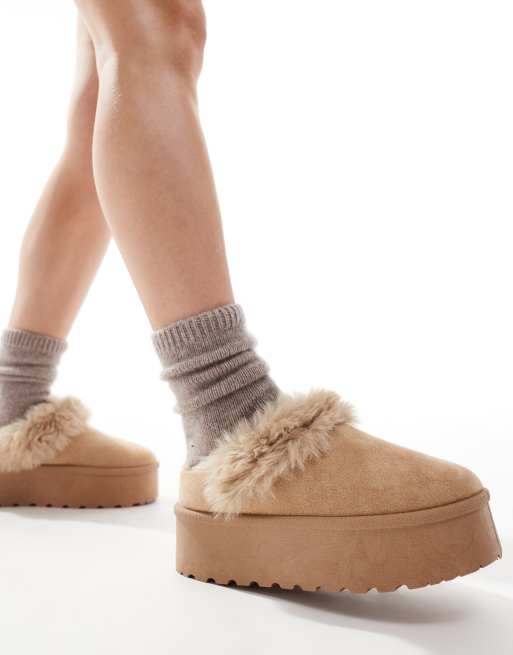 SEQWL faux fur flatform mules in sand