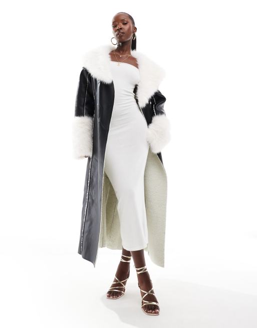 Simmi contrast faux fur trim faux shearling maxi coat in black and white