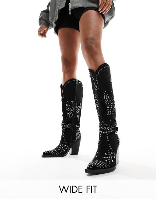 Simmi London Wide Fit Delano butterfly embellished western boot in black micro