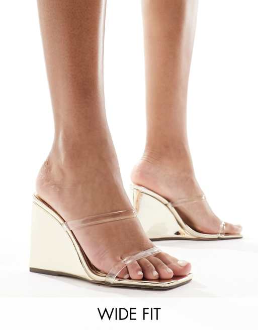 Simmi London Wide Fit Radial wedge heeled sandal in gold with clear straps