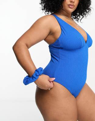 Simply Be crinkle plunge swimsuit with matching scrunchie in blue