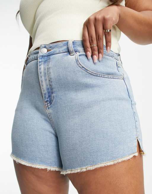 Simply Be frayed hem denim shorts in light blue wash