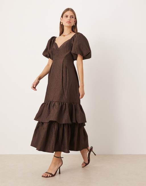 Dream Sister Jane antique textured jacquard midi dress in brown