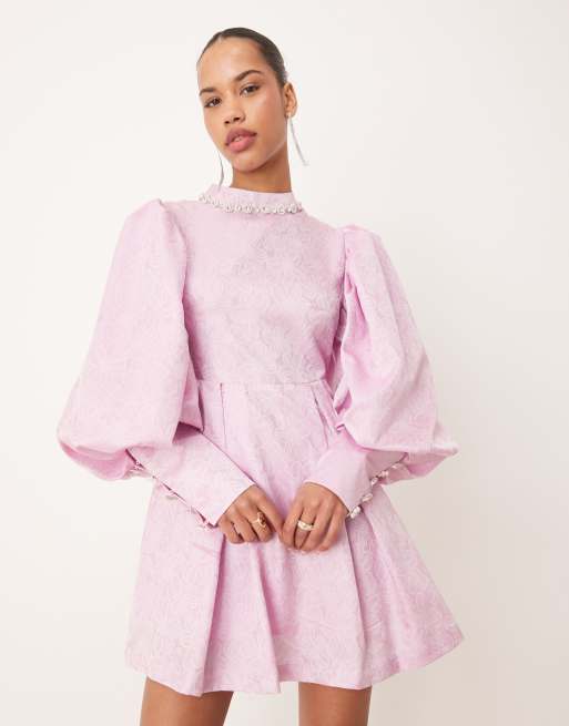 Dream Sister Jane balloon sleeve jewel jacquard mini dress in lilac pink