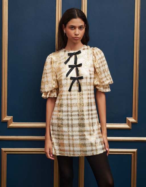 Dream Sister Jane bow front embellished check mini dress in gold