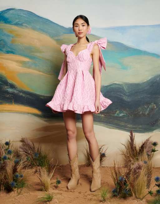 Dream Sister Jane jacquard bow ruffle hem mini dress in pink