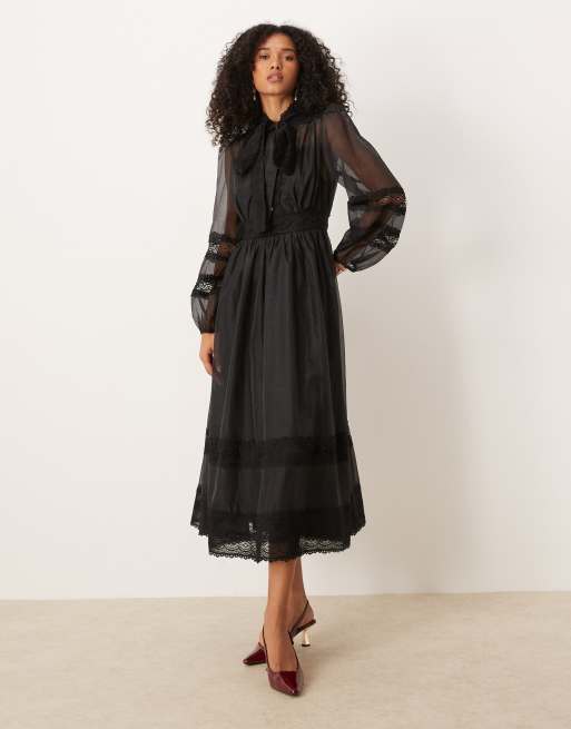 Dream Sister Jane sheer lace mix pussybow midi dress in black