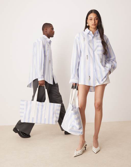 Sister Jane Unisex detachable fish brooch shirt and bag co-ord in blue stripe