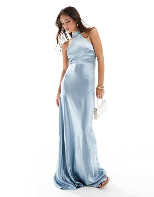 Six Stories Bridesmaid satin halter maxi dress in dusty blue