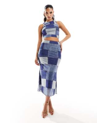 Sixth June co-ord mesh patchwork denim print maxi skirt in blue