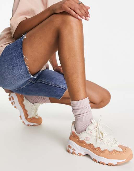 Skechers D'Lites layered wavy trainer in white and tan leather