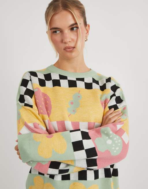 Skinnydip Checkerboard strawberry and olive knitted jumper in multi