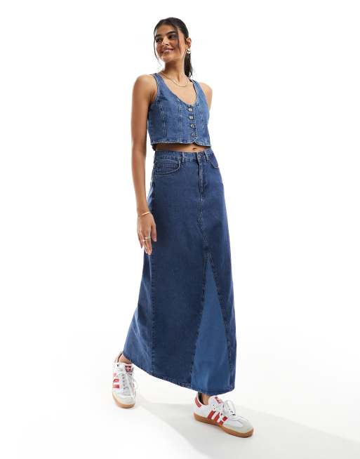 Something New Denim maxi skirt with contrast split front pannel co-ord in medium blue wash