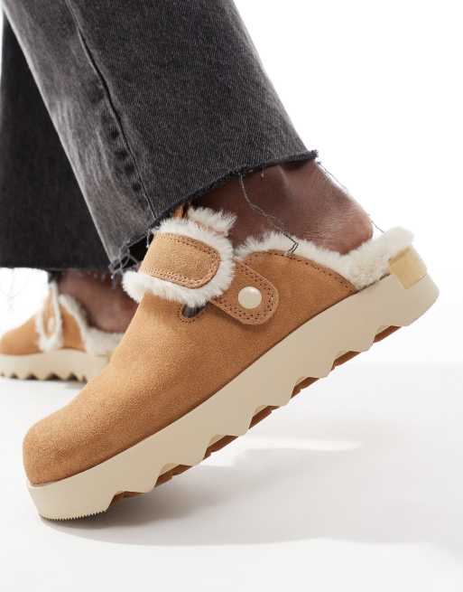 Sorel Viibe Cozy faux fur suede clogs in tawny buff and natural