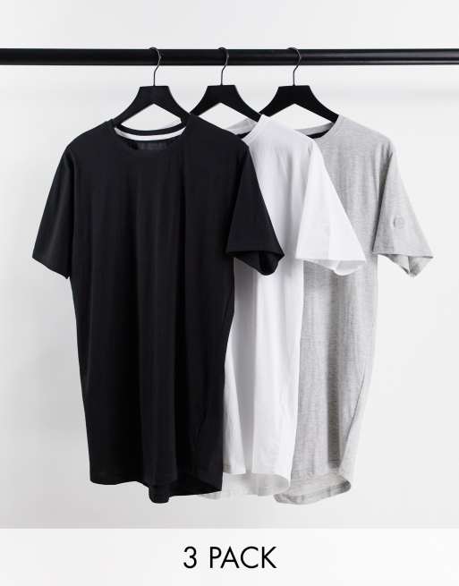 Soul Star 3 pack longline t-shirts in black white & light grey