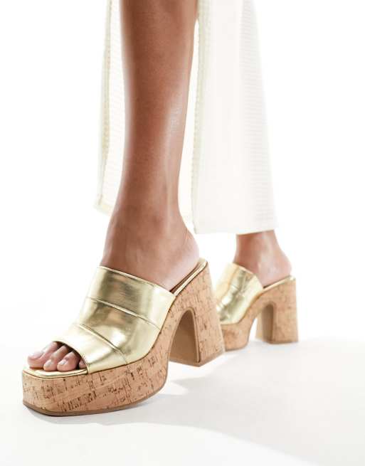 South Beach cork heeled mules in gold