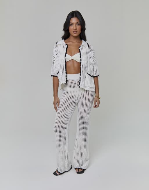 South Beach Crochet knit button front short sleeve shirt in white