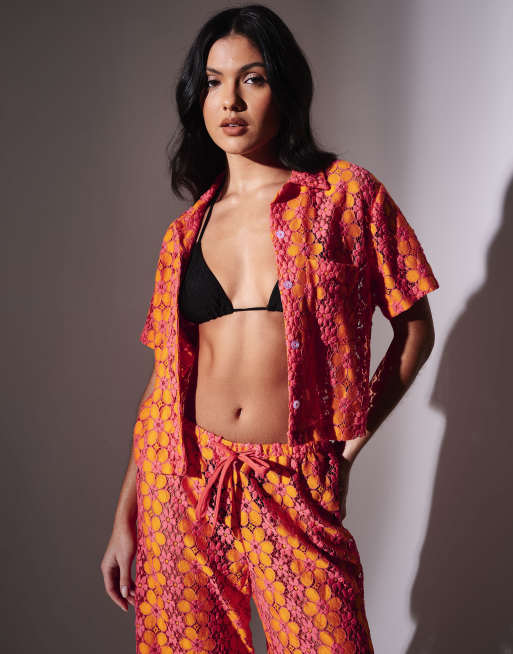 South Beach Floral crochet short sleeve shirt in multi