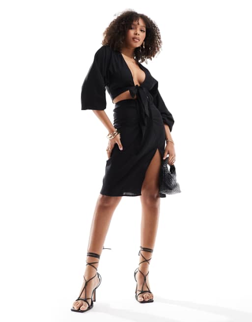 South Beach Linen look front knot draped midi skirt in black