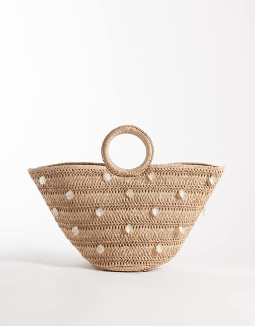 South Beach top handle straw bag with pearl shell embellishment in natural