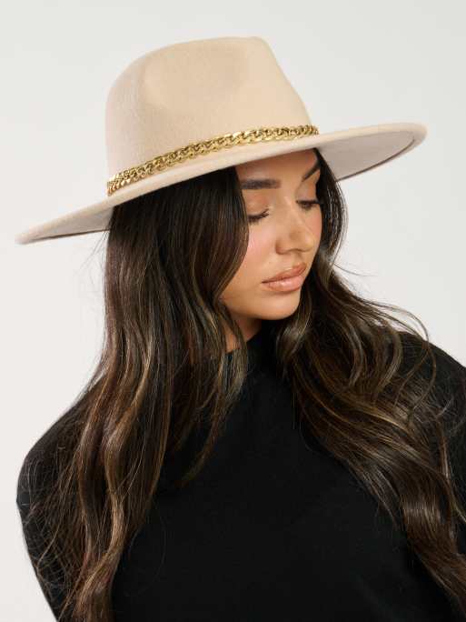 South Beach Wool fedora hat with gold chain in cream