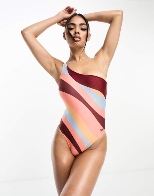 Speedo one shoulder swirl print swimsuit in burgundy and coral