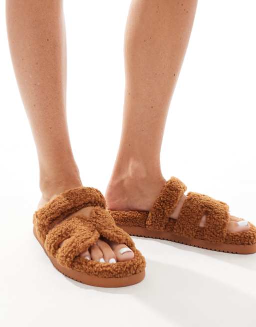 Steve Madden Missile-F slip on fluffy borg sliders in tan