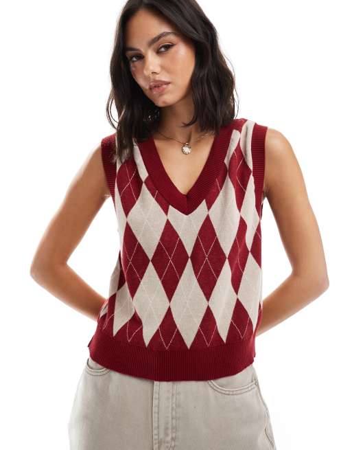 Stradivarius argyle knitted vest in burgundy