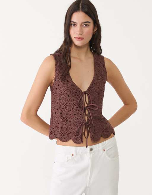 Stradivarius contrast crochet vest in brown