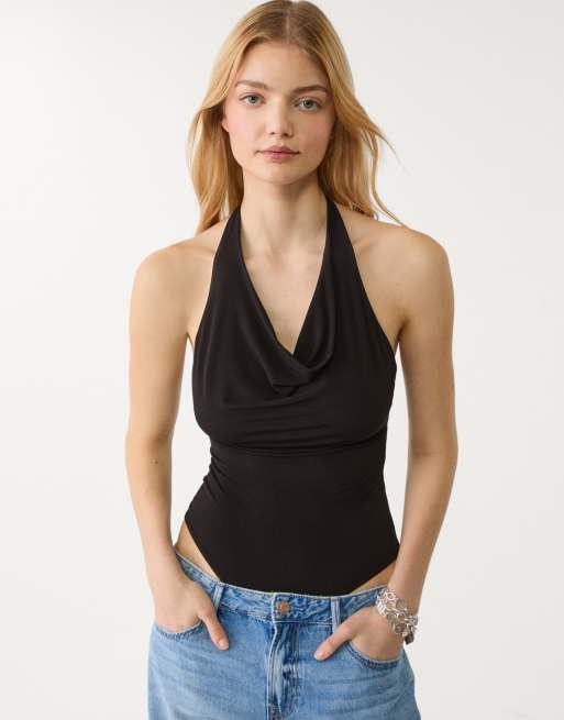Stradivarius cowl neck bodysuit in black