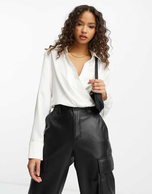 Stradivarius cropped satin wrapped blouse in white