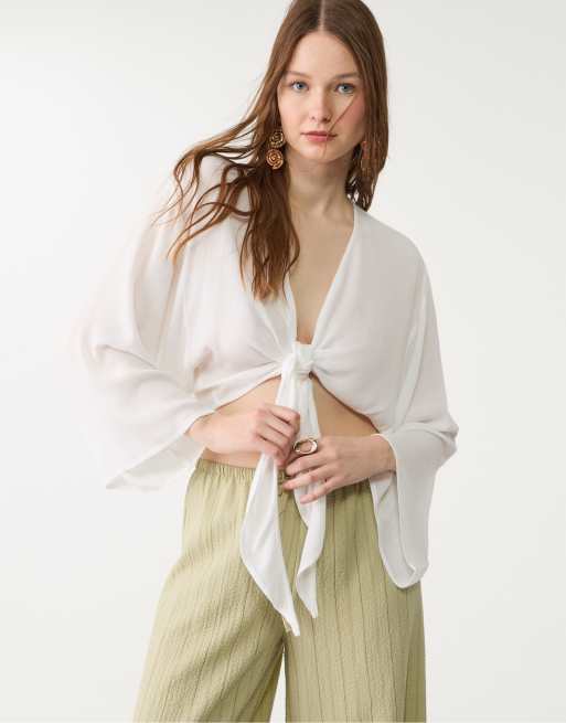 Stradivarius cropped tie front blouse in white
