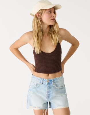 Stradivarius D75 ripped denim shorts in very dark/rinse wash blue