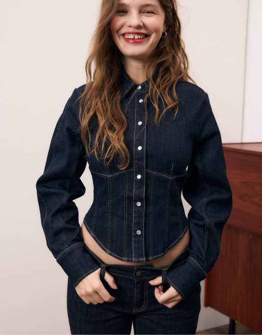 Stradivarius Denim corset shirt in overdyed blue denim