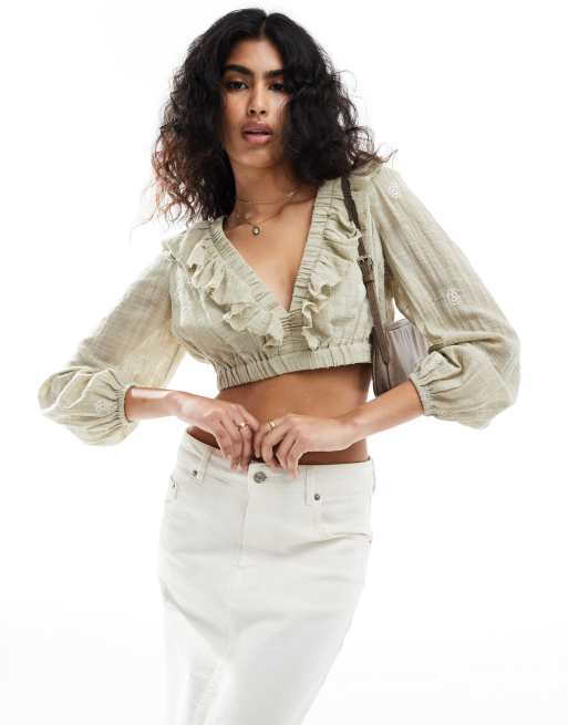 Stradivarius embroidery blouse with lace up back detail in khaki
