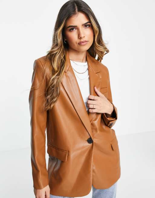 Stradivarius faux leather blazer in tan