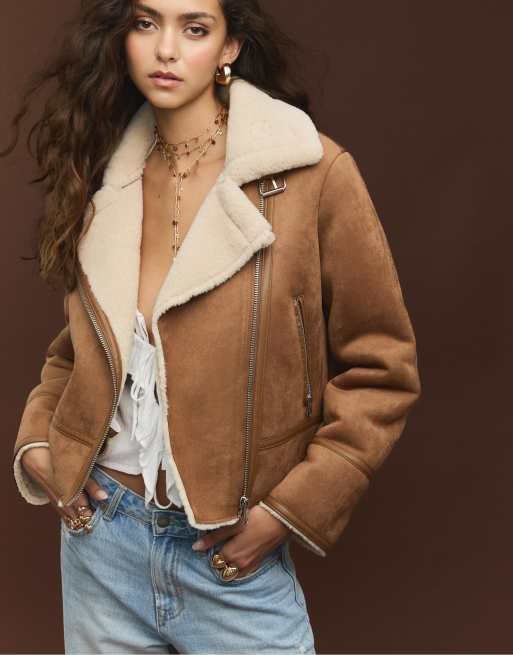 Stradivarius Faux suede biker jacket in camel