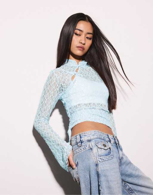 Stradivarius Long sleeve lace t-shirt in sky blue